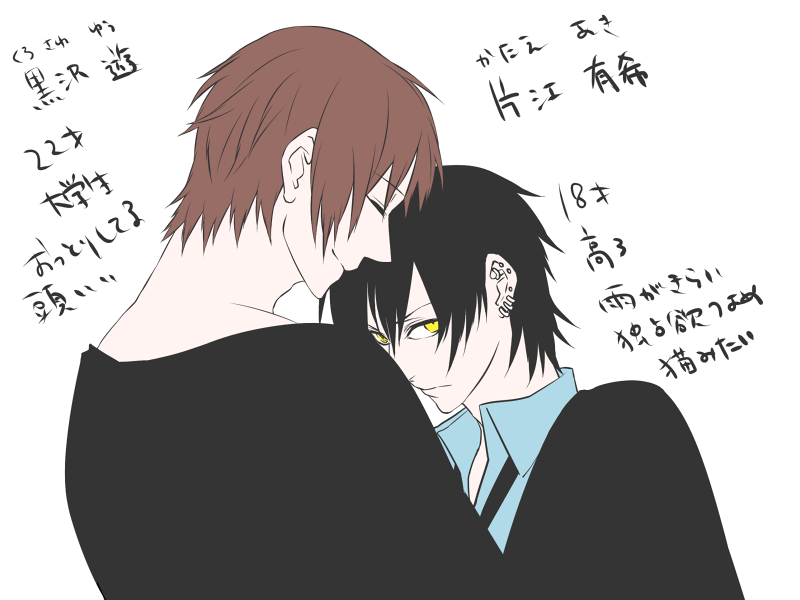 今まで設定が見つけられなくて焦ったことが多々あったので ★三大欲求ちゃん ◎飯風呂 (真ん中) 欲求三兄弟の長男。182cm。 大体台所か風呂場にいらっしゃる。 風呂場のカビは許さない。 料理上手。 睡魔を甘やかし煩悩をいじり倒している。でもどっちも大切な弟。 いろいろとゆるい。脳天気。 怒ると怖い。 ◎煩悩 (左) 次男。178cm。 好きな子はいじめたい派。 わりとお洒落さん。 頭脳労働は不得意でとりあえず襲っておけばいいと思ってる。 兄と弟が仲いいのでちょっとさみしい。 たまにかまってちゃんになる。 ◎睡魔 (右) 三男。168cm。 甘え上手な末っ子。好きな場所はおふとんの中。 おふとんから出ると誰かにくっつきたがる。 兄たちに比べて色白なのは夜型生活のせい。 昼間に外に出ると眠さのあまりそのままお昼寝してしまう。 夜も大体寝てる。寝かしつけようとして自分が寝る。 起きるときにはなぜか必ず食べ物の名前を叫ぶらしい。 ★歳の差 ◎遊 (左) 大学生のおにーさん。おっとりしてて成績がよい。 来年社会人。残りの大学生活は遊ぶだけの人。ちょろちょろバイトしてる。彼女有。 有希に勉強を教えている。ちっちゃい頃から仲良し。よく遊んでた。 ◎有希 (右) 高校生で受験生。 雨が嫌い。つんつんしてるけどぼっちはさみしい。 遊によくなついている。 ★めがね+つんでれ ◎日向/夏 (左) ゆーちゃん(真紀さん)ちの子。 綾敬とは幼なじみで家がおとなり。 何事にも前向き。大体飴を食べている。 変に検索ひっかからないか不安なやつ。 ◎伍藤 綾敬(右) 夏の幼なじみ。夏にはだいたいツン。たまにデレる。 あんまり気を使わなくていいから一緒にいて楽。 ★まじめっこ+不良? ◎名前未定 (左) 不良ってほどでもないけどとっても不真面目な学生さん。 校則などしらぬ。 普段そっけないくせに(右)が積極的になると可愛い可愛いしだす。 ◎名前未定 (右) 超がつくほど真面目な学生さん。 校則破るなどありえん。 わりと嫉妬しやすくて独占欲も(ヤンデレにならない程度に)あるけどうまく言葉にできなくてぎゅっとして終わる。 嫉妬してることは伝わってる。 でもそこから先に進めない。 随時追記 PR CommentsComment Form |