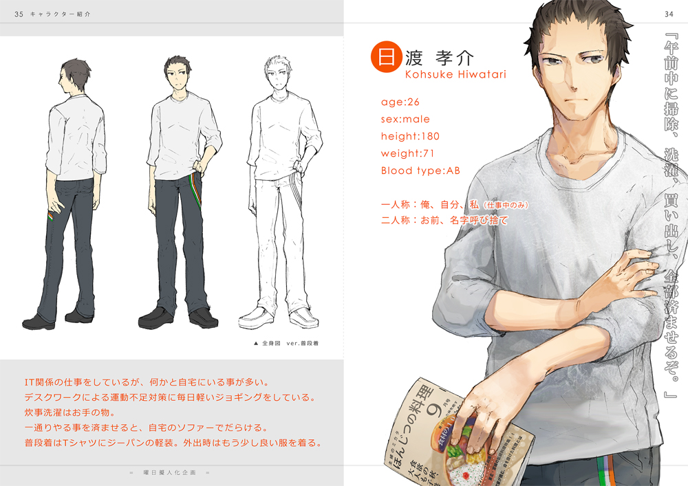 というわけで \曜日擬人化しませんか!?/ 要項作成:12.06.17 【注意】 ○腐向けです。(基本的に月曜総受けです。) ○ついった上での情報交換を必要としますので、ツイッタのアカウントをお持ちの方のみでお願いします。 ○全員男です。男にしてください。ほもをください。ホモォ┌( ^o^┐)┐ 予想外に早く曜日が埋まったので最後に祝日を追加しました。こちらはのんびりどうぞ。 それに伴い一部文章を変更しています。 【現在の状況】 以下決定済み(曜日) 月: 荊娜 様 火: ぱら 様 水: 博杜 様 木: あんり 様 金: りょー 土: シカバネ 様 日: 桐谷宥紀 様 【詳細】 ○曜日擬人化した子を描くだけです。っていうと元も子もない。 ○先着順で ○描いていただいたイラストは、設定画のみこちらに転載したいです。何も言われない場合はこのページに転載します。転載されたくない!という方は予めお伝え下さい。 ○設定画以外のイラストは好きなときに好きなように描いて好きな場所に好きな形で投稿していただいて構いません。 ○この企画で生まれたキャラは、他の参加者様が自由に借りて描けるものとします。 ぴくしぶで言うところの描いてもいいのよタグです ○腐向けですので、他の曜日・祝日とイチャイチャする可能性があります。┌(┌ ^o^)┐ ○キャラを制作した時点で完了となりますが、せっかくなのでいっぱい描いて萌えたらいいと思う。っていうか萌えをください。 ○担当者様が決定したあとは、担当者様のみが担当する曜日の設定を変更できるものとします。 ○最終的な設定は、イラストが完成した時点で決定するものとします。 【キャラ制作上の流れ】 ○まずは参加表明をしてください。 ○担当していただく ○参加表明はツイッタ上でりょー(@0mofmof0)へリプライしてください。それ以外は受け付けません。 ○参加表明をされた方は次の項に書く各曜日の設定を踏まえキャラの設定およびイラストを制作してください。 ○祝日の設定は全て担当の方にお任せします。年に1回の子なのでもうフリーダムでいいと思う。 ○キャラの設定は、ツイッタのりプライで○曜日の設定と明記した上で@0mofmof0までお送りください。このページに反映します。 ○イラストが完成したら、インターネット上にアップロードし、そのアドレスをお送りください。このページ【設定】に追加します。 ○担当する曜日の設定とイラストが揃った時点で完了となります。 【設定】 ●月曜日:香月蒼(こうづき あおい) イメージカラー:青~シアン、青寄りの緑などの寒色 さらさらへあー 眼鏡(黒縁)装備 ほんわか幼な笑顔 草食系男子 一人称:俺 人を呼ぶ時は~くん、~さん、という丁寧ぶり。 お人好し。 171cm 57kg 足25.5cm 19歳くらい O型っぽい ●火曜日:火崎 飛鳥(ひざき あすか)