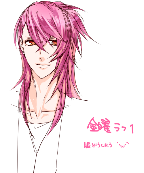 ※泣き黒子は削除します イメージカラー:黄色~橙、華やかな色 ・イメージカラー: ・髪:ピンク ・チャラい ・気分屋。朝と夜でテンションがかなり違う。夜は元気。 ・月曜にイタズラするのが楽しくて仕方ない。 ・身長は180cmくらい(180ある!と主張している。本当はちょっと足りない。) ・23歳 ・B型 ・一人称:俺 ・二人称:お前 割とおおざっぱで適当。無駄にフレンドリーで時折鬱陶しい ・他の曜日の呼び方 月曜→蒼、あおたん 木曜→いっちー ●土曜日:岐土 一海(きど かつみ)