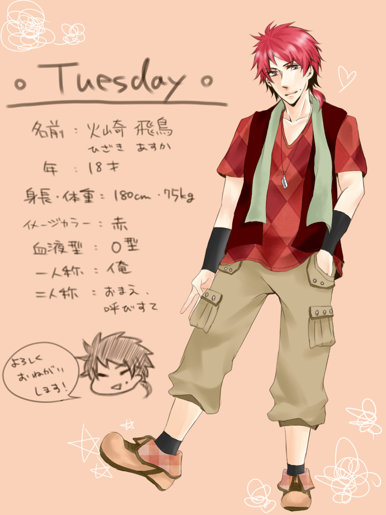 というわけで \曜日擬人化しませんか!?/ 要項作成:12.06.17 【注意】 ○腐向けです。(基本的に月曜総受けです。) ○ついった上での情報交換を必要としますので、ツイッタのアカウントをお持ちの方のみでお願いします。 ○全員男です。男にしてください。ほもをください。ホモォ┌( ^o^┐)┐ 予想外に早く曜日が埋まったので最後に祝日を追加しました。こちらはのんびりどうぞ。 それに伴い一部文章を変更しています。 【現在の状況】 以下決定済み(曜日) 月: 荊娜 様 火: ぱら 様 水: 博杜 様 木: あんり 様 金: りょー 土: シカバネ 様 日: 桐谷宥紀 様 【詳細】 ○曜日擬人化した子を描くだけです。っていうと元も子もない。 ○先着順で ○描いていただいたイラストは、設定画のみこちらに転載したいです。何も言われない場合はこのページに転載します。転載されたくない!という方は予めお伝え下さい。 ○設定画以外のイラストは好きなときに好きなように描いて好きな場所に好きな形で投稿していただいて構いません。 ○この企画で生まれたキャラは、他の参加者様が自由に借りて描けるものとします。 ぴくしぶで言うところの描いてもいいのよタグです ○腐向けですので、他の曜日・祝日とイチャイチャする可能性があります。┌(┌ ^o^)┐ ○キャラを制作した時点で完了となりますが、せっかくなのでいっぱい描いて萌えたらいいと思う。っていうか萌えをください。 ○担当者様が決定したあとは、担当者様のみが担当する曜日の設定を変更できるものとします。 ○最終的な設定は、イラストが完成した時点で決定するものとします。 【キャラ制作上の流れ】 ○まずは参加表明をしてください。 ○担当していただく ○参加表明はツイッタ上でりょー(@0mofmof0)へリプライしてください。それ以外は受け付けません。 ○参加表明をされた方は次の項に書く各曜日の設定を踏まえキャラの設定およびイラストを制作してください。 ○祝日の設定は全て担当の方にお任せします。年に1回の子なのでもうフリーダムでいいと思う。 ○キャラの設定は、ツイッタのりプライで○曜日の設定と明記した上で@0mofmof0までお送りください。このページに反映します。 ○イラストが完成したら、インターネット上にアップロードし、そのアドレスをお送りください。このページ【設定】に追加します。 ○担当する曜日の設定とイラストが揃った時点で完了となります。 【設定】 ●月曜日:香月蒼(こうづき あおい) イメージカラー:青~シアン、青寄りの緑などの寒色 さらさらへあー 眼鏡(黒縁)装備 ほんわか幼な笑顔 草食系男子 一人称:俺 人を呼ぶ時は~くん、~さん、という丁寧ぶり。 お人好し。 171cm 57kg 足25.5cm 19歳くらい O型っぽい ●火曜日:火崎 飛鳥(ひざき あすか)