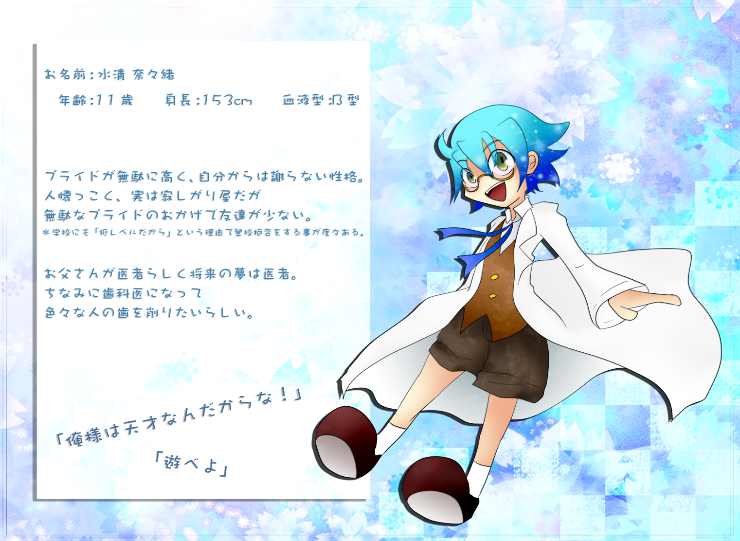 ・二人称:お前、呼び捨て・短髪 ・情熱的 ●水曜日:水清 奈々緒(みずきよ ななお) イメージカラー:黒、青、寒色 ・白衣 ・腹黒 ・ショタ ・身長153cm ・11歳 ・血液型:B ●木曜日:木保 国逸 (もくぼ くにいつ)
